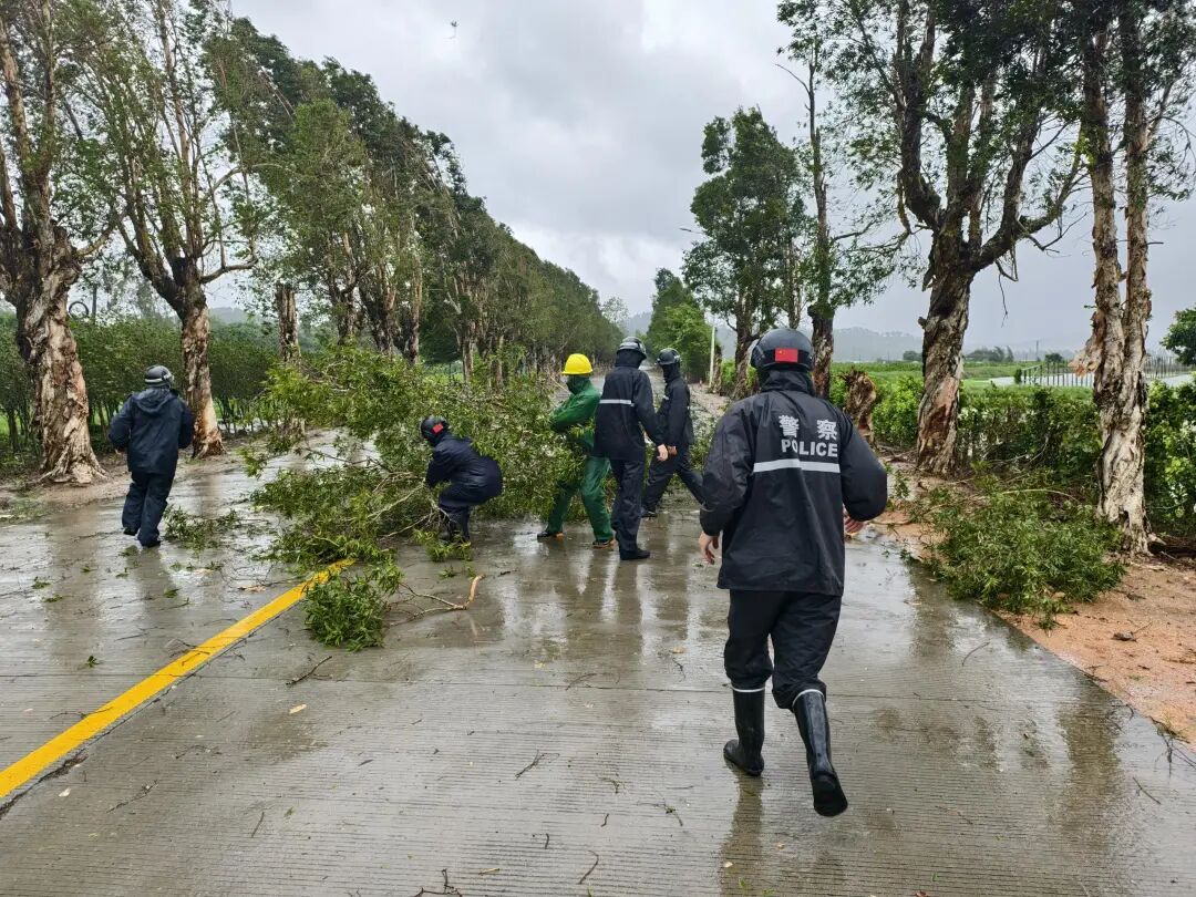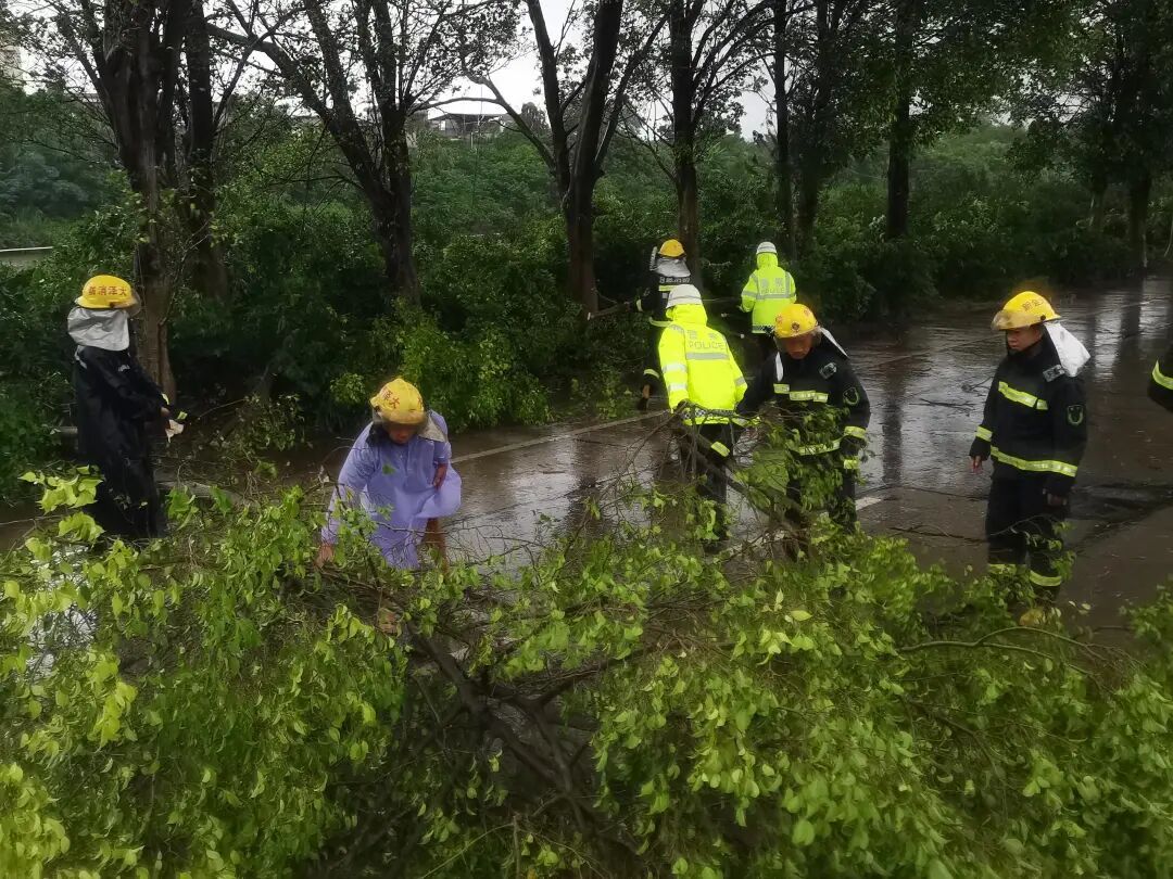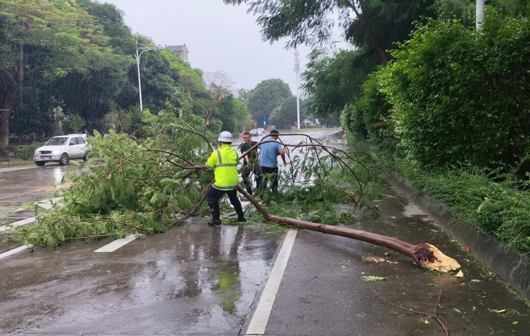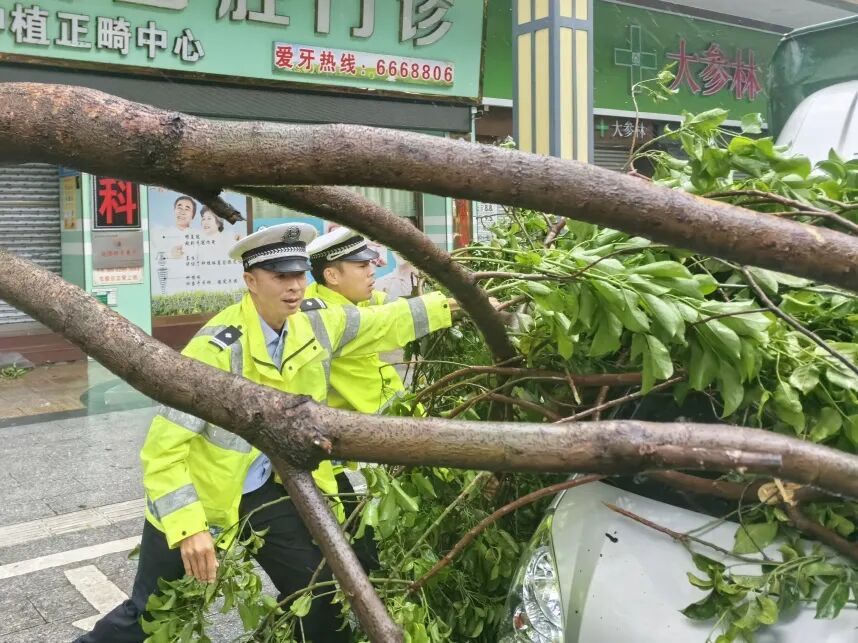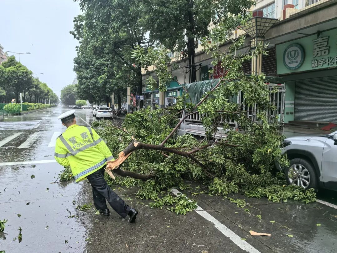 24日,受台风影响,暴风暴雨来袭,新会区部分道路出现不同程度的树木倒伏情况。新会公安迅速反应,联合相关部门合力清除路面安全隐患,确保道路通畅。