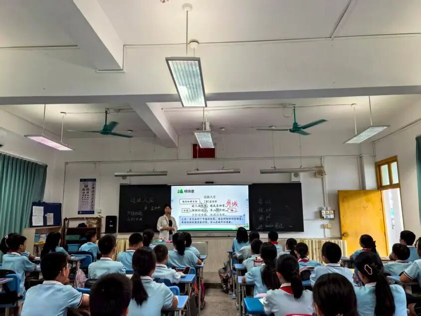 本次推普周,郑熹老师带了经典古诗《过故人庄》的深度赏析课。在郑老师的引领下,学生走进孟浩然的田园诗境,感受汉语声韵的和谐之美,品味“开轩面场圃,把酒话桑麻”中蕴含的深情与远意。这既是一节诗文鉴赏课,更是一堂普通话声情表达的实践课——在平仄交错间提升语言素养,于经典诵读中传递文化温度。